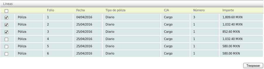 El sistema le mostrará las pólizas registradas en el "Cuenta origen", ahora seleccione la póliza que desea traspasar habilitando la pequeña casilla ubicada al costado izquierdo.