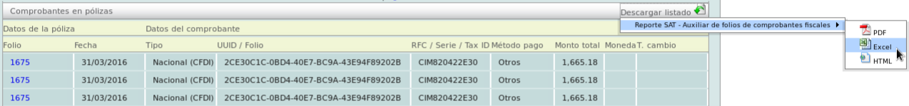 Nota: También puede descargar el reporte de pólizas en formato PDF, XLS (Excel) o HTML, para realizar esta acción, dé click en la opción "Descargar Listado".