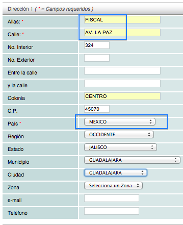 Nota: La "Dirección 1" deberá ser el domicilio fiscal de su cliente y como "Alias" debe poner el dato "FISCAL".