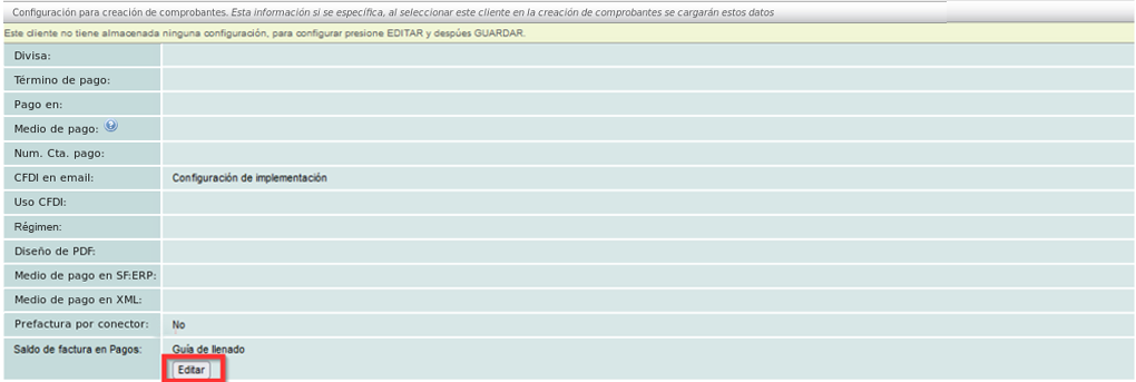 En seguida se mostrarán los comprobantes que usted le ha generado, en la parte inferior de la pantalla encontrará los apartados para editar los datos de facturación. Dé click en el botón "Editar" para activar los campos.