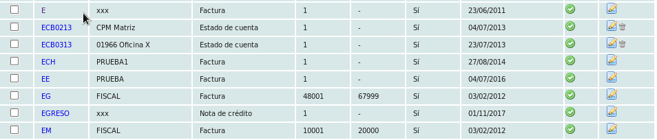 El sistema le mostrará la lista de series registradas, indicando el nombre, la dirección asignada y el tipo de comprobantes que genera. De click en el nombre de la serie.