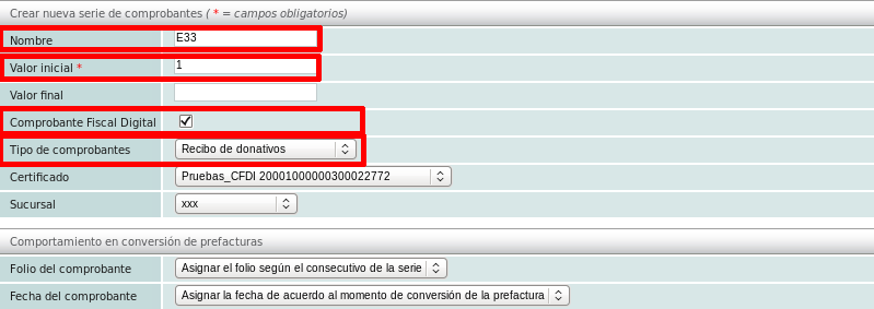 En el menú que se muestra especifique un "Nombre", el "Valor inicial" (generalmente "1"), que esté activa la casilla de "Comprobante Fiscal Digital" y que en "Tipo de comprobantes" se especifique algún valor.