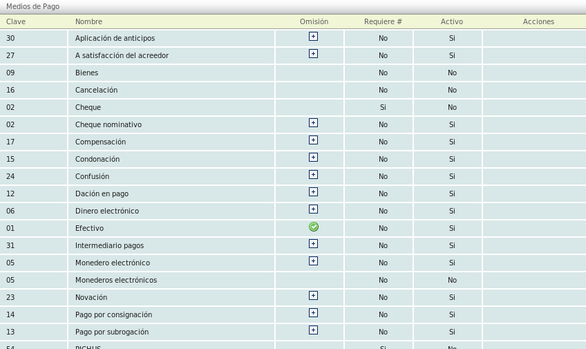 Se mostrarán los medios ya registrados. Podrá ver todos los medios de pago así como establecer el medio de pago por omisión de un CFDI si lo desea.