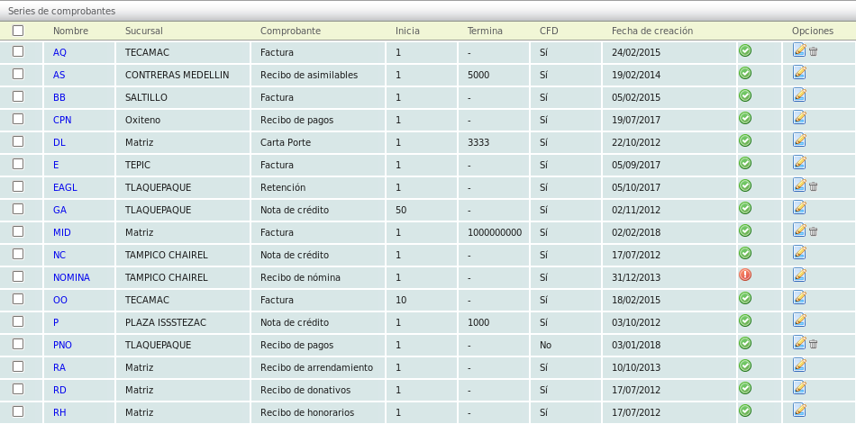 Si el cliente contrata el módulo de Nómina, se activa por defecto la serie "RN" para recibos de nómina. Si se activa el módulo Complemento Carta Porte se genera la serie "T" y si contrata Retenciones se utiliza "RET". Sin embargo, usted puede definir