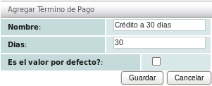 Necesitará especificar el "Nombre" y el número de "Días" para el nuevo término de pago. Si selecciona la casilla de la opción "Es el valor por defecto?" este nuevo término será el nuevo valor por defecto ya que solo puede haber uno.