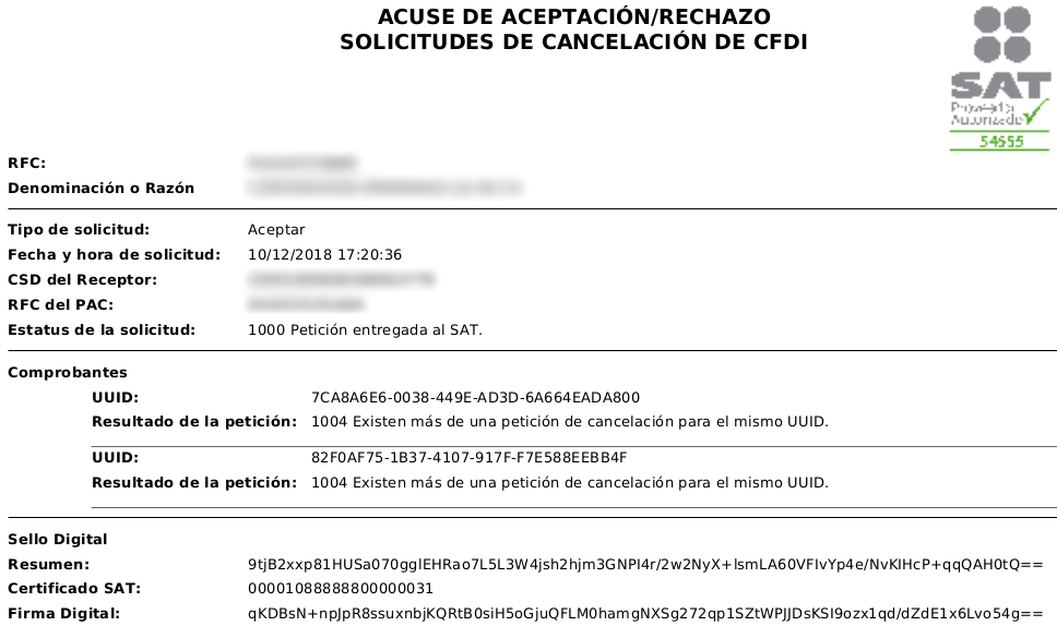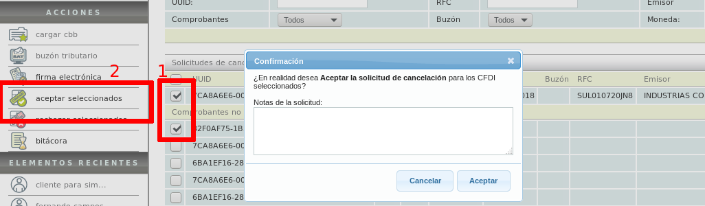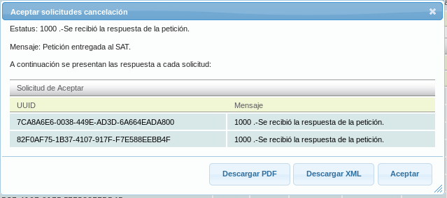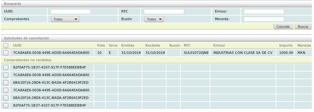 Received requests will be displayed. Those in the "Solicitudes de cancelación" category are requests for e-documents that you have in the system. Those in the "Comprobantes no recibidos" category are requests for e-documents that you do NOT have in the system.