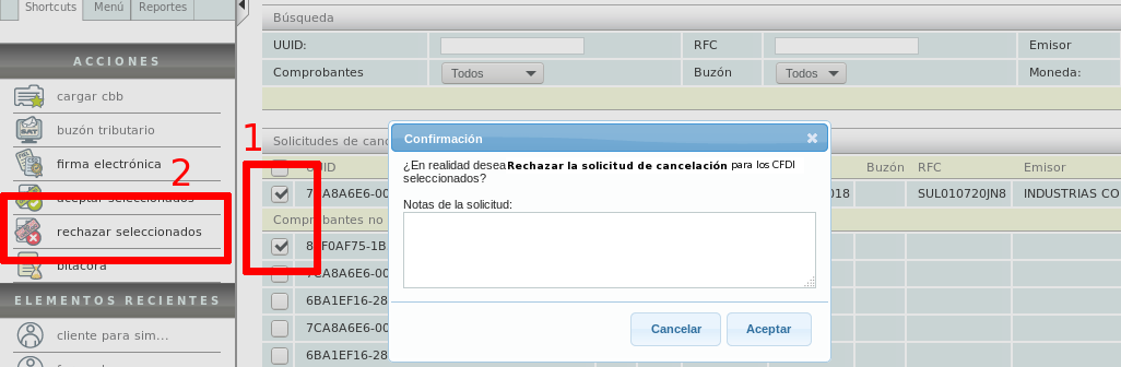 To reject one or more requests, first select them. Then click on the "rechazar seleccionados" action.