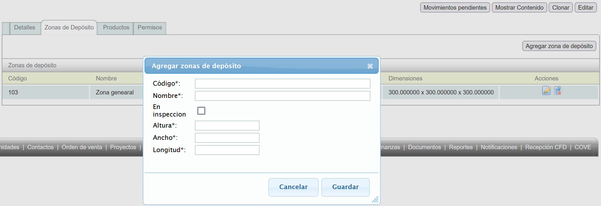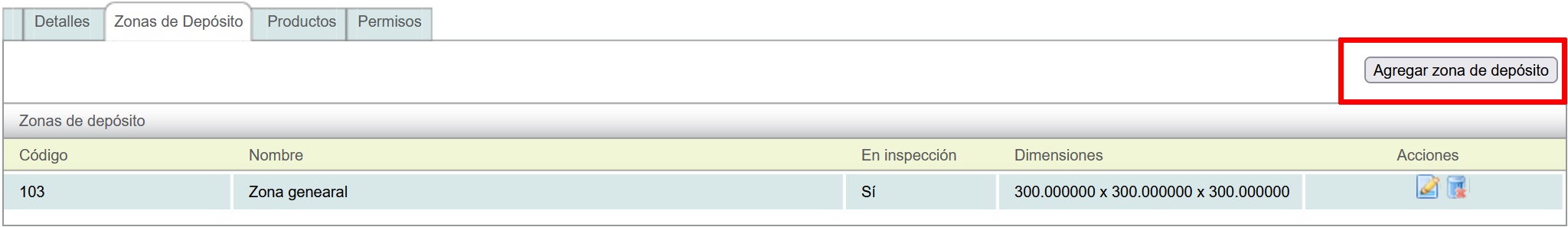 Finally, click on the "Zona de Depósito" tab and then on the "Agregar zona de depósito" button.