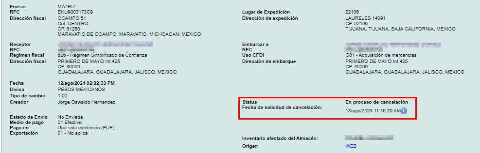 Note: The SAT (Mexican Tax Administration Service) may take some time to complete the cancellation of an invoice. It is recommended to check the process in the CFDI tab.