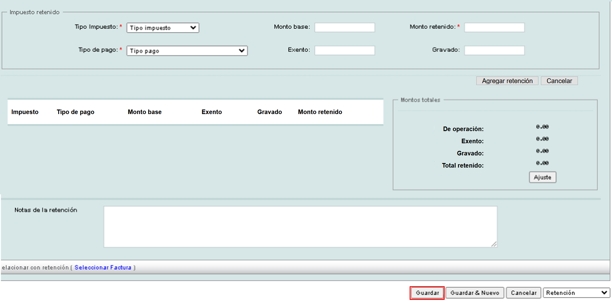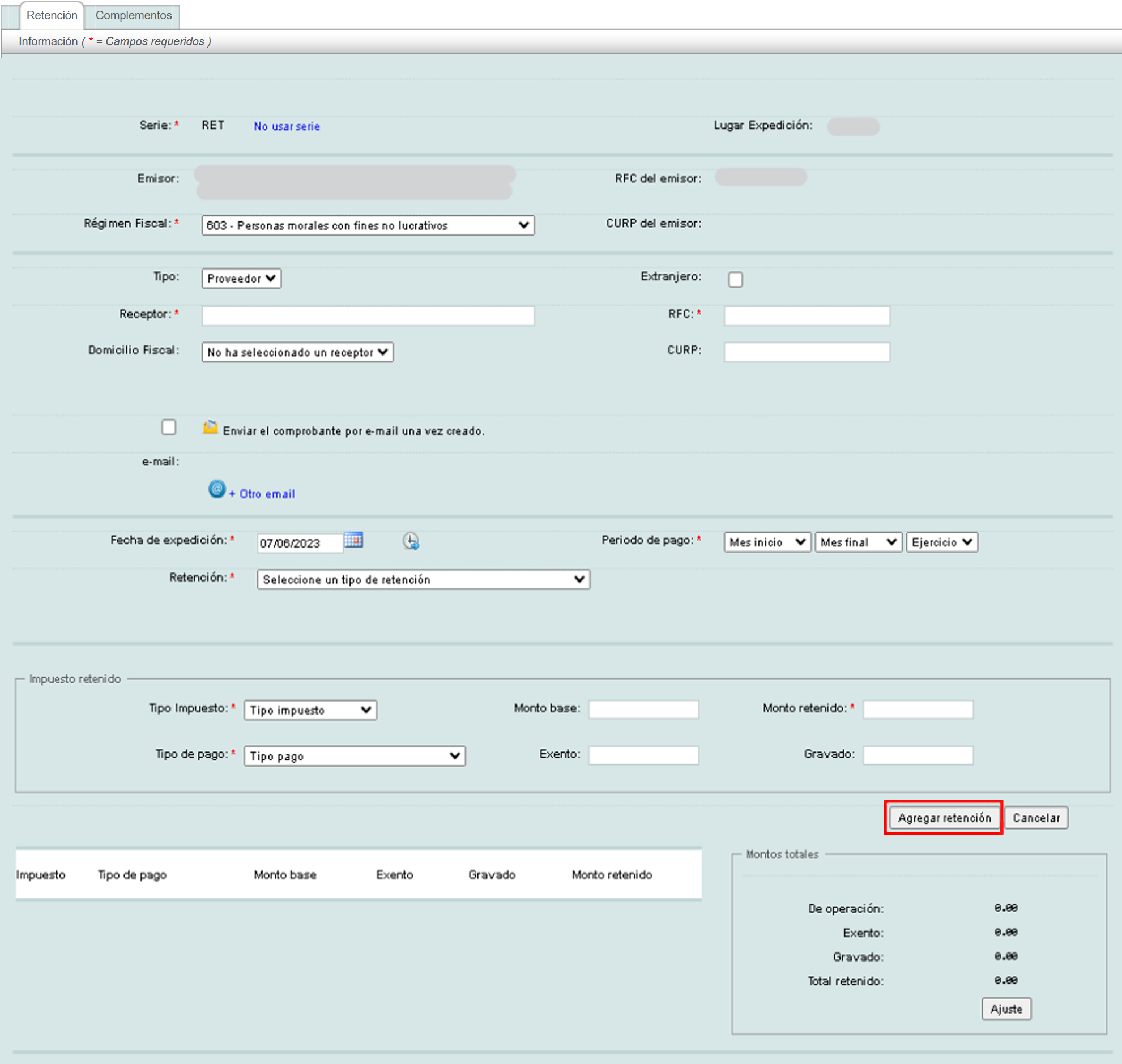 In the "Impuesto retenido" section you can add the necessary withholding; once the data is filled in, click on the "Agregar retención" button.