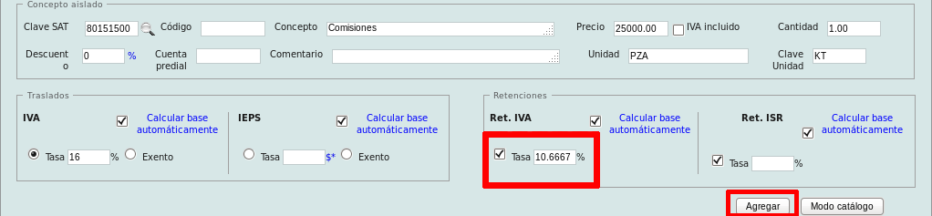 Al agregar un concepto, diríjase a la sección "Retenciones" y dé click en