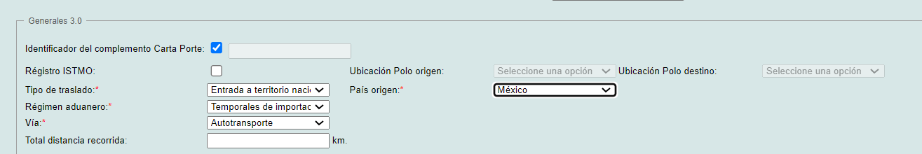 Luego, en la primera sección "Generales 3.0" llene los campos requeridos: "Tipo de traslado*"