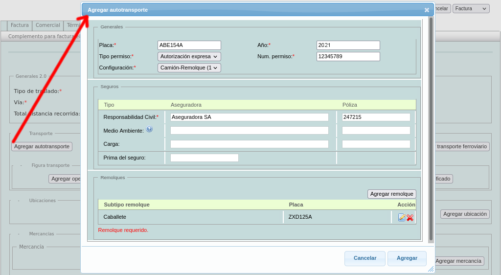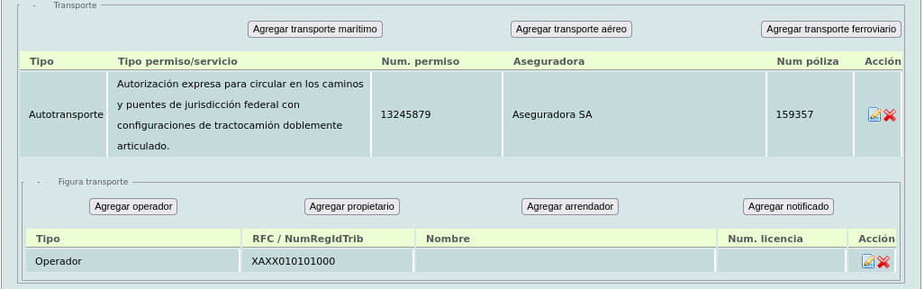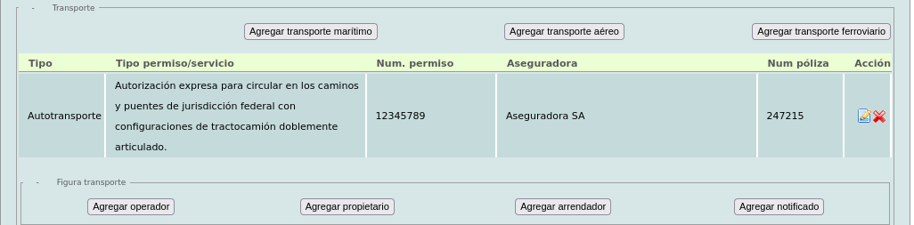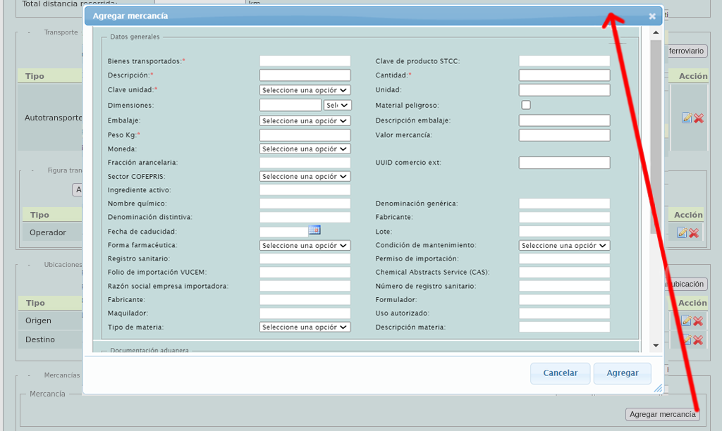 En la siguiente sección "Transporte" añada el tipo de transporte, a continuación aparecerá un desplegado. Es necesario llenar todos los campos.