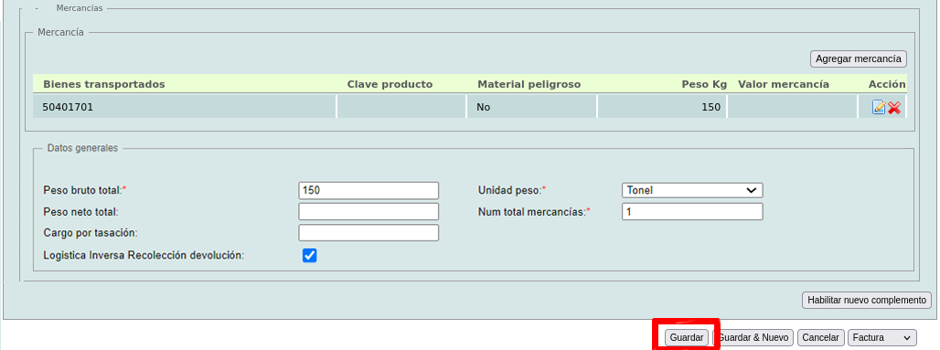 Por último llene los campos "Peso bruto total", "Unidad peso" y "Num total mercancías". En caso de requerir la opción de "Logística inversa Recolección devolución" marque la casilla.
