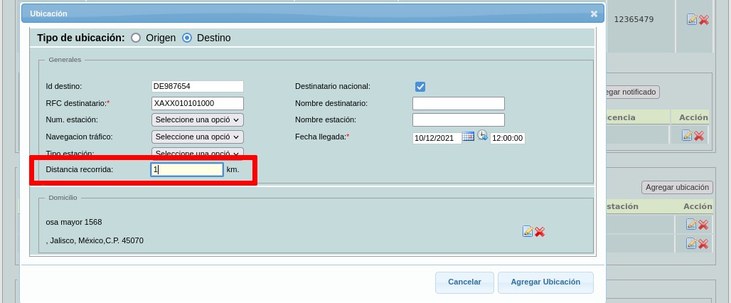 Nota: Para la ubicación de destino hay un campo adicional