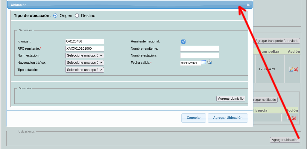 Sólo los campos RFC remitente y Fecha salida son obligatorios, los campos de Id origen (ubicación origen)