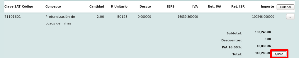 A continuación se mostrará el resumen de los productos agregados y los totales de la factura. Encontrará un botón de "Ajuste" al lado del total de la factura. Esta acción le permite editar manualmente los montos de la factura, pero tenga en cuenta que esto ya no lo permite el SAT y por lo tanto si intenta crear la factura después de editar los montos calculados por el sistema, este no creará la factura.