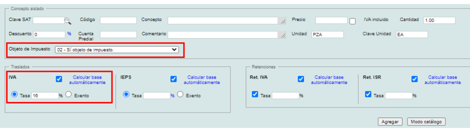 If an isolated concept is captured, it displays the new attribute "Objeto de impuesto", which has a default value of "02-Si objeto de impuesto" that taxes the transferred IVA tax, otherwise, it must be changed manually.