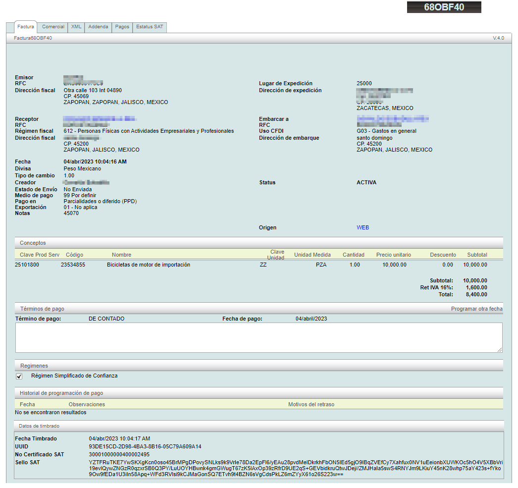En este resumen encontrará información sobre la creación del comprobante (Fecha / Creador / Envío / Forma de pago) y el estatus (Activa / Cancelada).