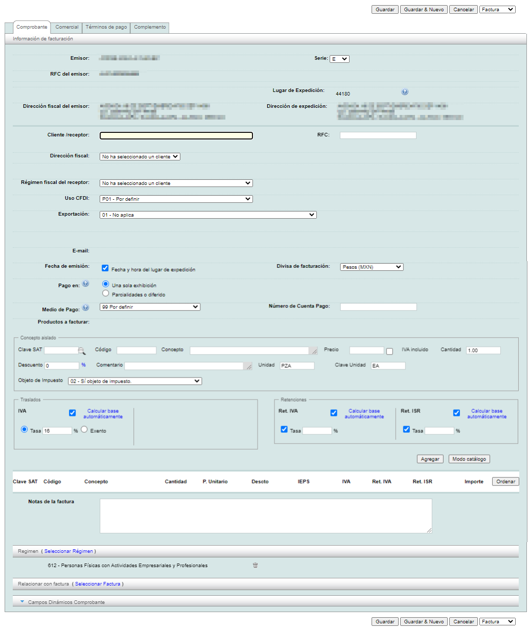 Se mostrará el formulario donde deberá ingresar la información del comprobante electrónico. A continuación veremos de forma general cada una de las secciones que lo conforman.