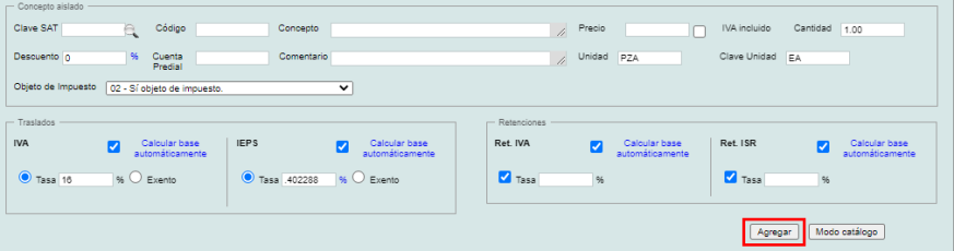 Necesita como requisito mínimo especificar el producto/servicio, precio, cantidad, unidad, clave de unidad y objeto de impuesto para poder agregarlo.