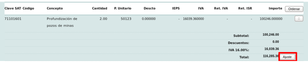 A continuación se mostrará el resumen de los productos agregados y los totales de la factura. Encontrará un botón de "Ajuste" al lado del total de la factura. Esta acción le permite editar manualmente los montos de la factura, sin embargo, esto no es permitido por el SAT y por lo tanto, si intenta crear la factura después de editar los montos calculados por el sistema, no se creará la factura.