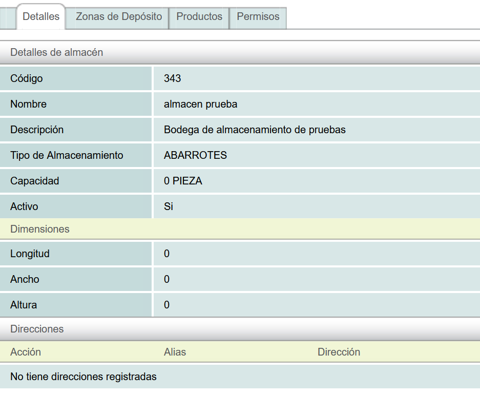 Finalmente, de click en la accion "crear almacén" del menú "Acciones" a la izquierda de la pantalla.