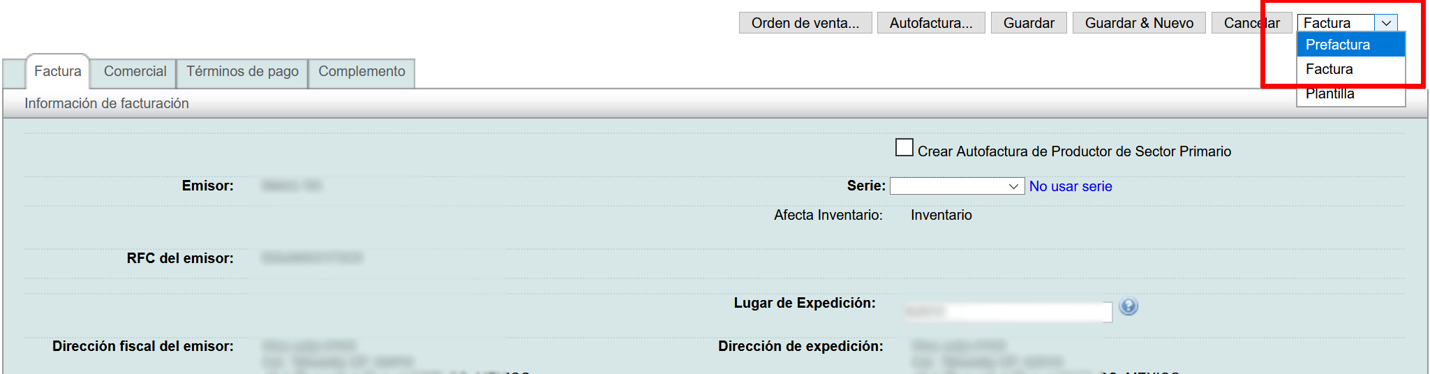 In the menu, to the right of the "Cancelar" button, select the "Prefactura" option. The fields are exactly the same as those of a regular invoice; once you have filled in the fields, save the pre-invoice.