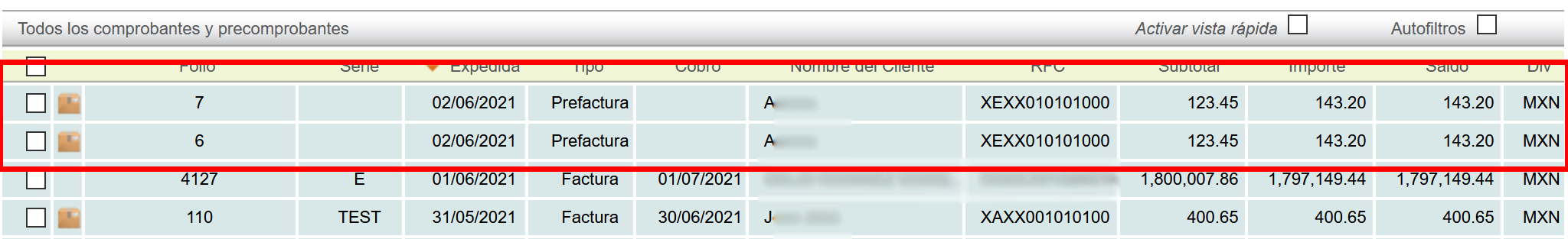You can find the created pre-invoice(s) within the Invoicing module. You can identify them by the "Tipo" column, which should display the value "Prefactura". To continue, click on the pro forma invoice to view it.