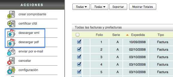La descarga de uno o más comprobantes desde el sistema de facturación se realiza al seleccionar los comprobantes dando click en la pequeña casilla ubicada al costado izquierdo, al realizar esta acción se activarán las opciones dentro del menú "Acciones".