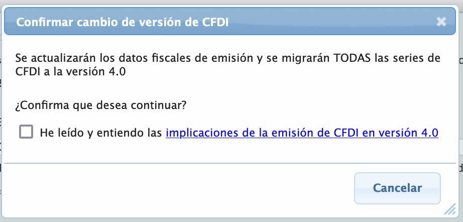 Seleccione la casilla "He leído y entiendo las implicaciones de la emisión de CFDI en versión 4.0". Select the box "I have read and understand the implications of issuing CFDI in version 4.0".