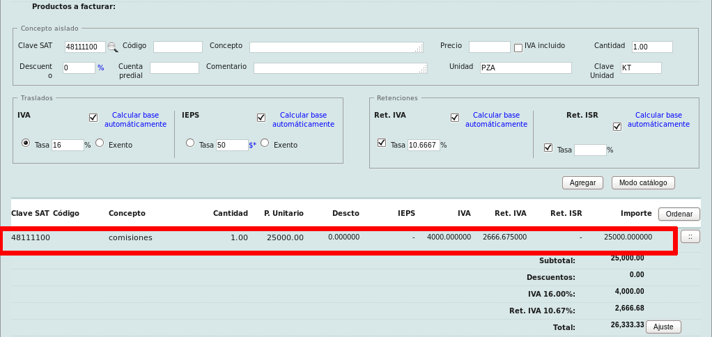 Diríjase a la sección "Productos a facturar" para registrar al menos un concepto, precio y cantidad.