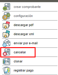 Enseguida, diríjase a la factura original (a cancelar) y de click en el menú "Acciones" del lado izquierdo, luego seleccione la opción “Cancelar”.