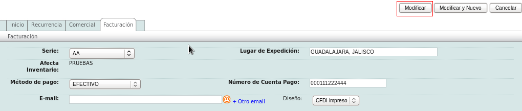Go to the "Invoicing" section and specify the "Serie", "Lugar de Expedición", "Método de pago" and "Número de Cuenta Pago", and click on the "Modificar" button.