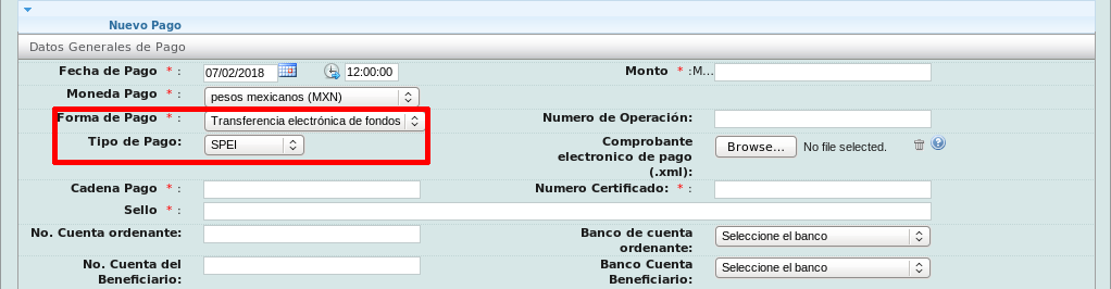 Enseguida, deberá recabar los datos generales de pago. Primero especifique la fecha y hora de pago, monto y moneda de pago.