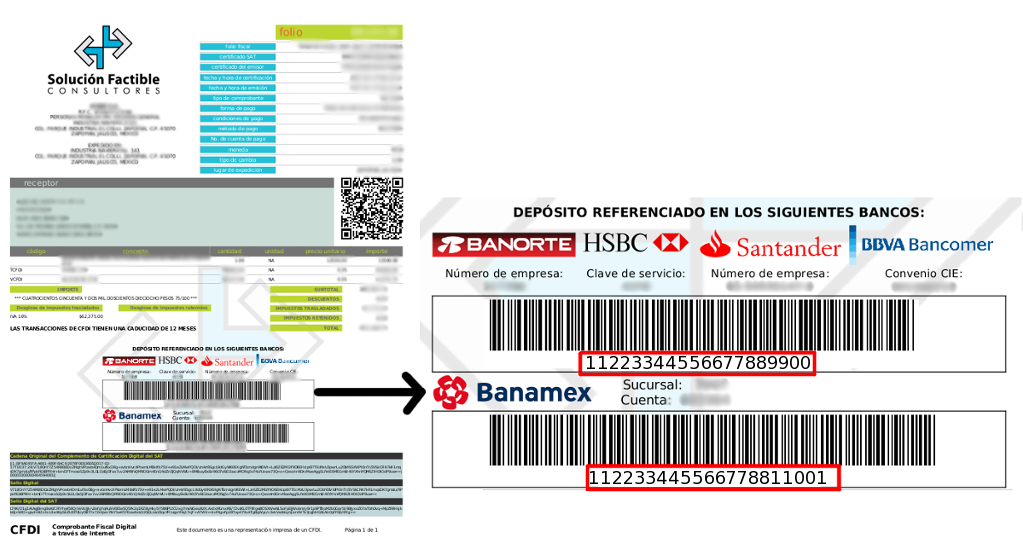 en la parte inferior de la factura, arriba de la cadena original. En los bancos mostrados