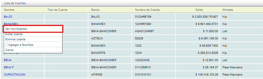 El sistema mostrará todas las cuentas activas en el portal, deberá dar click en la cuenta y se desplegará un recuadro de opciones, seleccione "Ver movimientos".