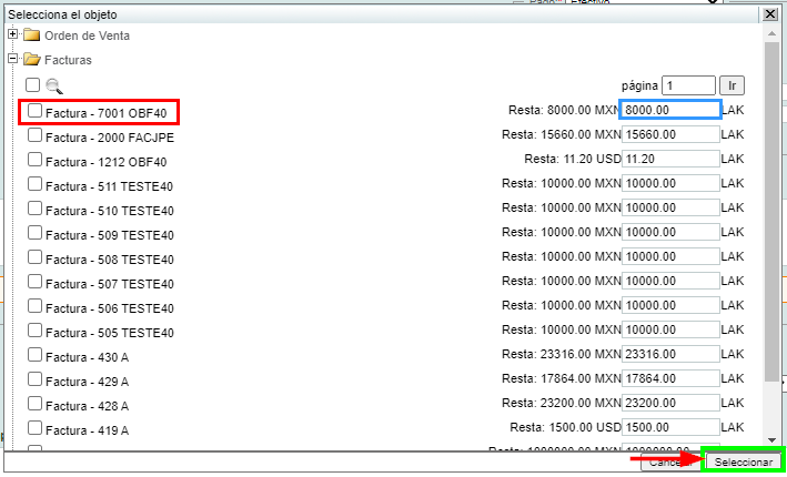 De click en la carpeta "Facturas", al realizar esta acción, el sistema mostrará las facturas (comprobantes) que cuentan con saldo. Seleccione las facturas a registrar el pago (ingreso) dando click en la pequeña casilla ubicada en el lado izquierdo, en la misma línea del comprobante selccionadodel lado derecho, indique el monto pagado de dicho comprobante, al terminar de seleccionar los documentos, de click en el botón "Seleccionar" localizado en la esquina inferior derecha de la ventana.