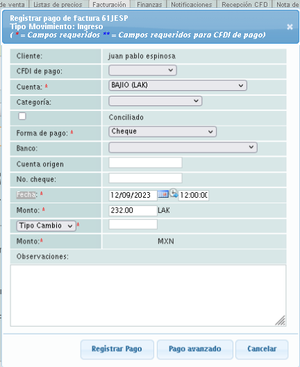 Se mostrará la ventana de registro de pagos. Seleccione la serie que configuró con anterioridad para los complementos de pago. Si no ha registrado una puede ver la lección ID-106.5.2.