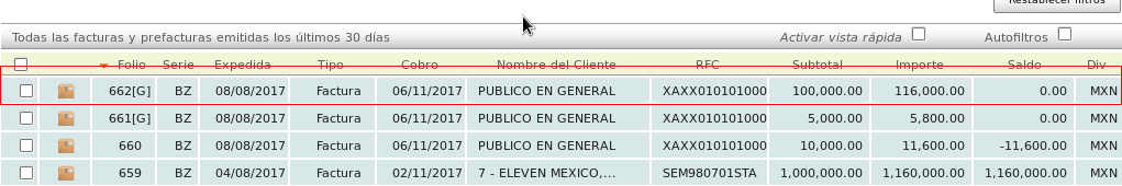 Seleccione la factura y de click en ella. Para reconocer mejor las facturas globales, estas se muestran con una "[G]" a la derecha de la serie. En este caso se usará la factura con serie 662[G].