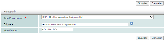 En el recuadro principal, en la opción "Tipo de percepciones" se agrega la percepción "002 Gratificación anual (Aguinaldo)", donde se le agrega una "Etiqueta" que lo identifique y una clave "Identificador". Para añadirla de clic en "Guardar".
