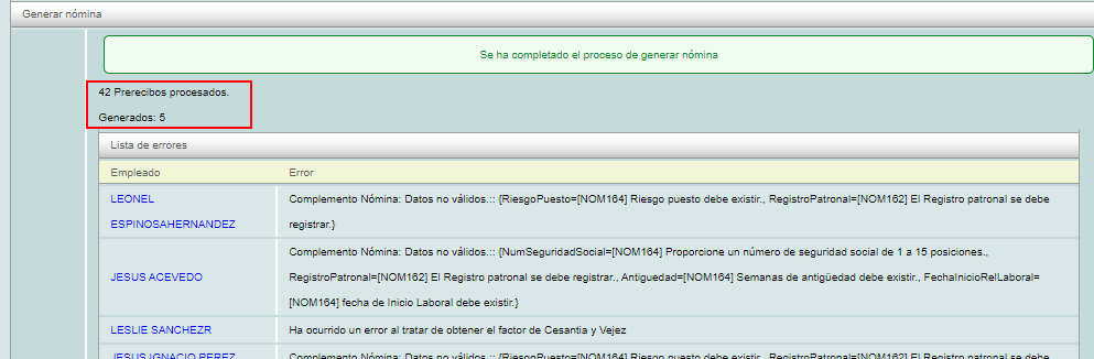 El sistema le mostrará el desglose de comprobantes generados así como los errores obtenidos por empleado. Revise los errores y ajuste los datos del empleado para corregirlos.