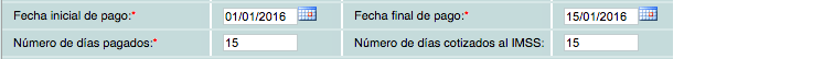 Seleccione las fechas de pago "Fecha inicial de pago", "Fecha final de pago" y "Número de días pagados", estos datos se registrarán de forma automática, si desea modificarlas, puede utilizar el pequeño calendario ubicado al costado derecho de cada fecha para seleccionar el día deseado.
