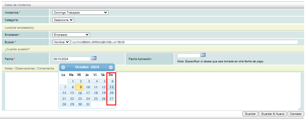Nota: esta incidencia se deberá replicar en cada domingo que el empleado labore.