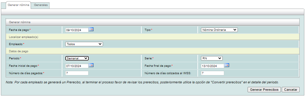Nos dirigimos al modulo de nómina y damos clic en la opción “Generar nómina” e indicamos los datos correspondientes y damos clic en Generar pre-recibos. Se realizará el llenado correspondiente de los siguientes conceptos.