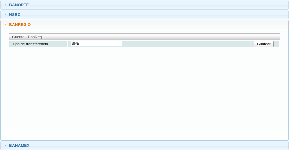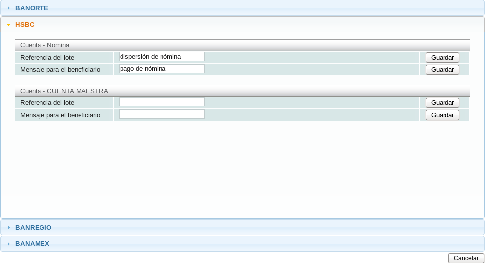 Se mostrarán los bancos disponibles para dispersión de nómina los cuales requieren de cierta información particular. Dé click sobre un banco para desplegar su información y llene las casillas de la cuenta de su preferencia y por último dé click en el botón "Guardar" a la derecha de cada casilla.