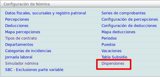 Se mostrarán las opciones de configuración para nómina, elija "Dispersiones".
