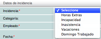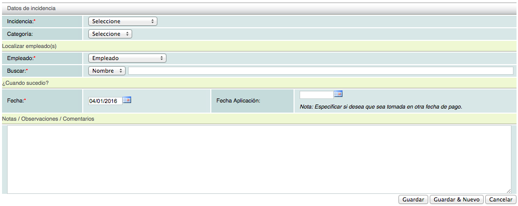 Al dar click se mostrará el formulario donde deberá ingresar la información de la incidencia así como las fechas de aplicación y el empleado al cual se aplicarán.