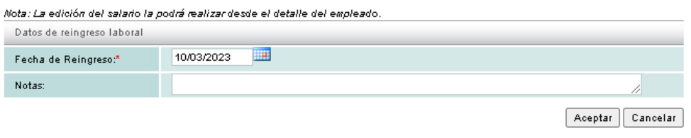 En seguida se mostrará el formulario donde deberá registrar la fecha de reingreso y notas del empleado.