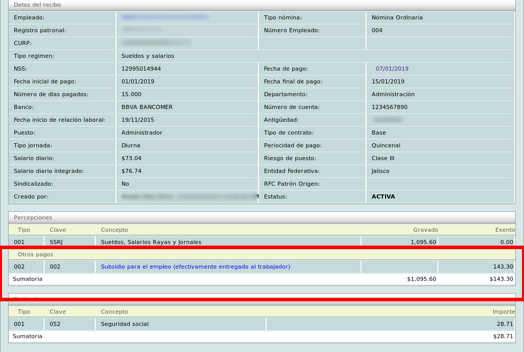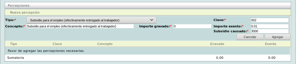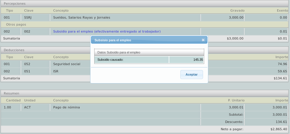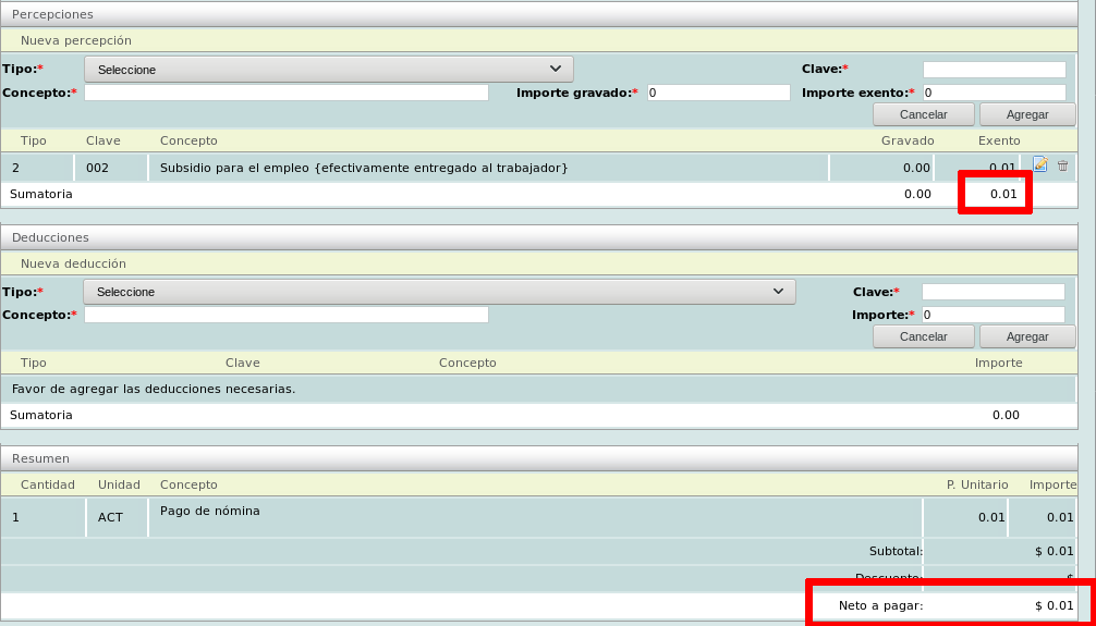 Tras agregar el subsidio podrá ver que es requerido hacer el pago neto por 1 centavo para no incurrir en las validaciones aritméticas. Si desea agregar una deducción para compensar este centavo deberá hacerse de forma manual.